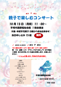 10月13日(月・祝)に、平塚市西部福祉会館にて「親子で楽しむコンサート」を開催します。