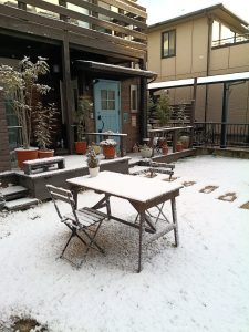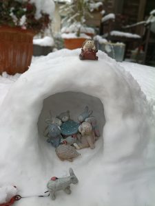 いつもは玄関前で生徒さんをお出迎えしているどうぶつたちが雪に埋もれてしまったので、子どもとかまくらを作ってあげました。