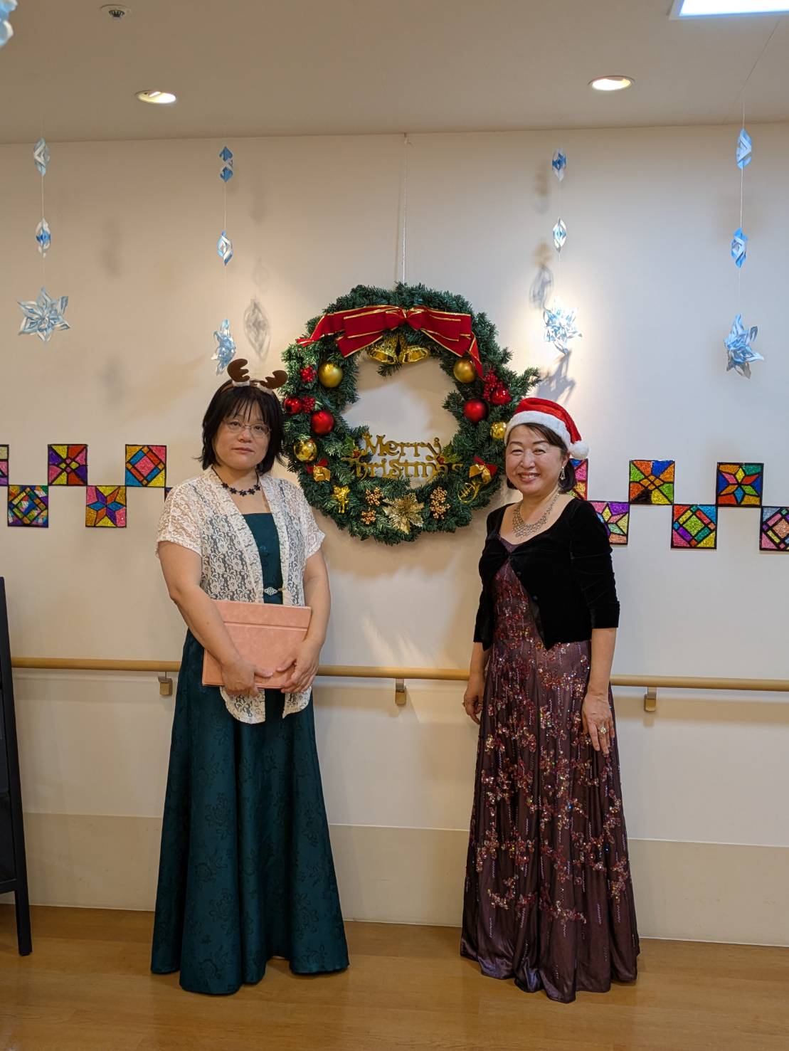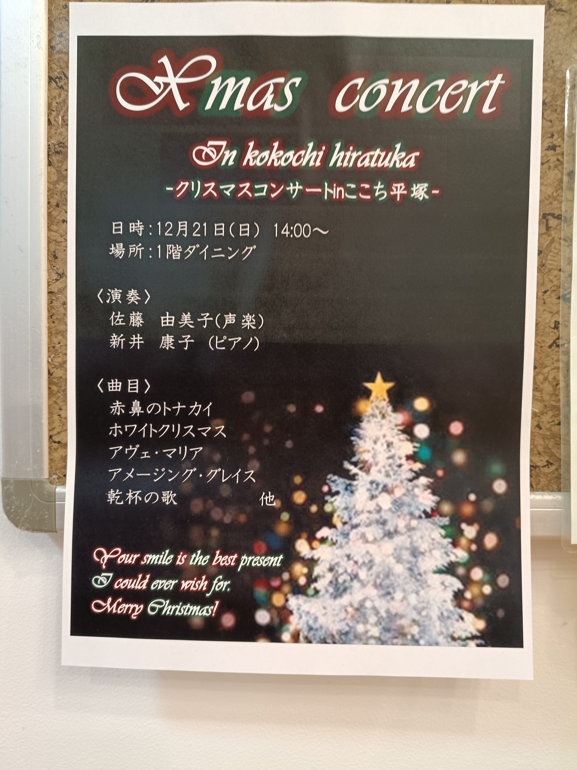 平塚の介護付き老人ホーム「ここち平塚」で、ソプラノの佐藤由美子さんと一緒にクリスマス演奏をしてきました。